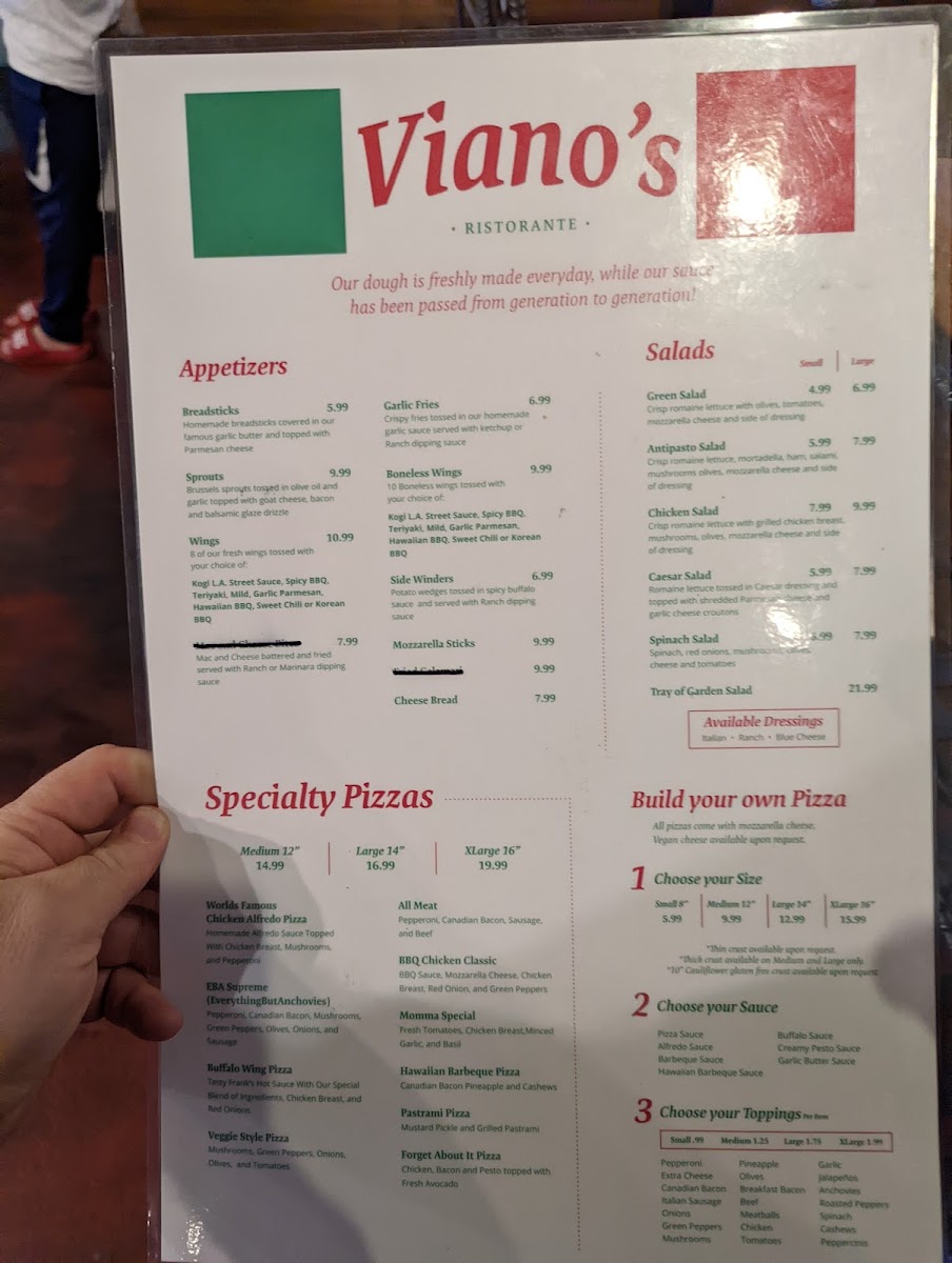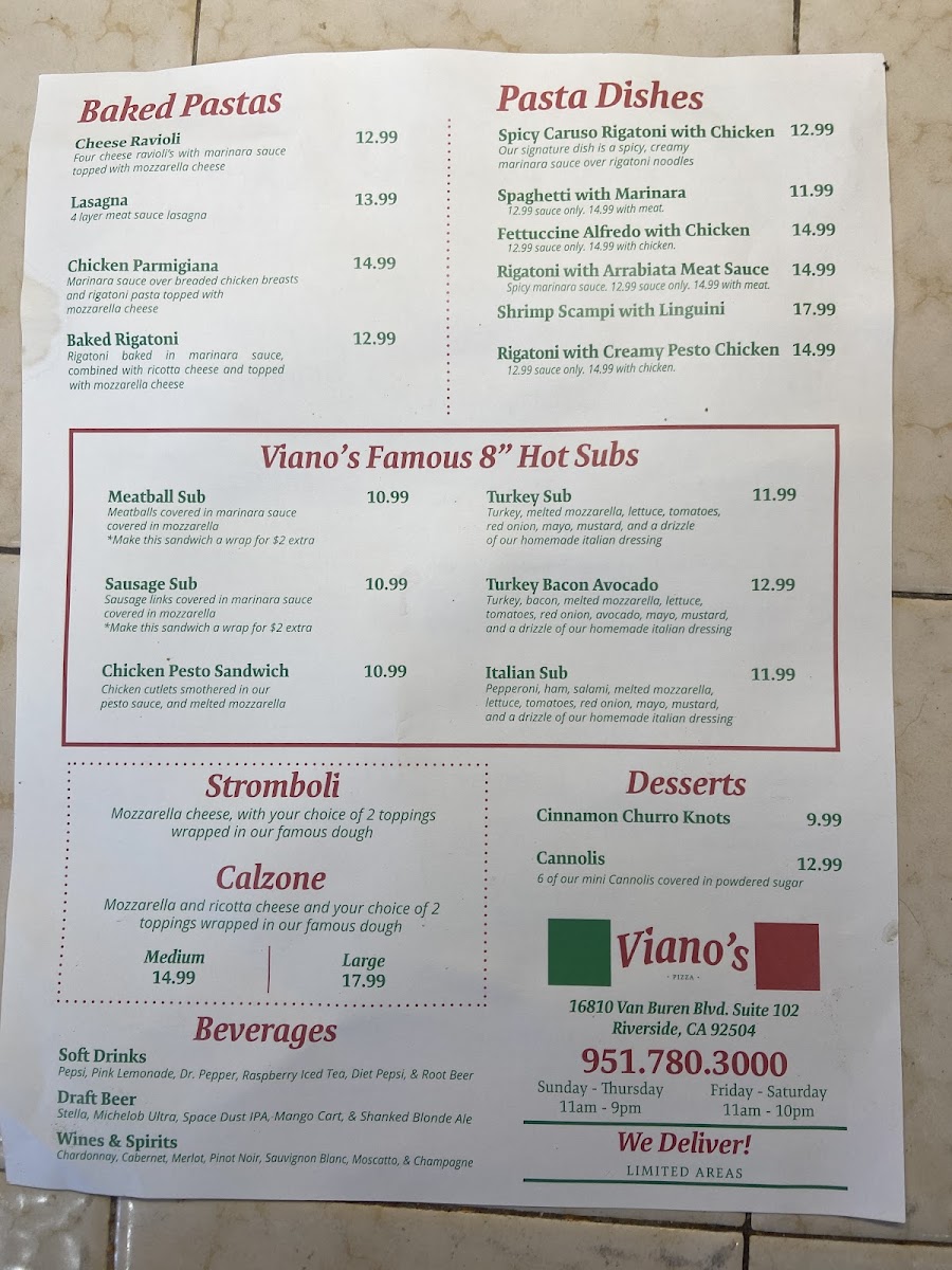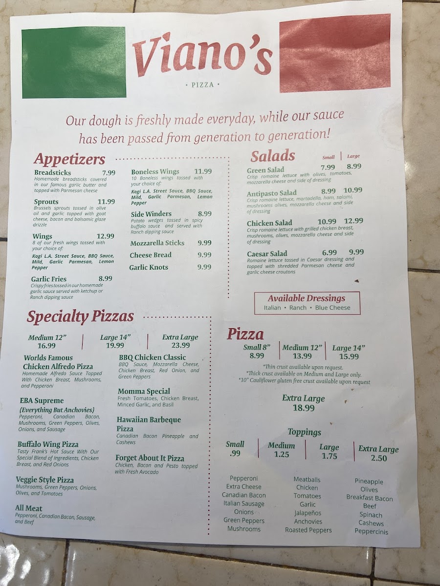 As a reviewer looking back at the full menu of Viano’s Pizza, it’s clear that this spot is designed to satisfy everything from quick cravings to family-sized feasts. The pizza selection is the heart of the menu, highlighted by the value-driven $40 Family Deal - $40 Family Deal, alongside a wide range of specialty pies like the Large World Famous Chicken Alfredo Pizza, EBA Supreme (Everything But Anchovies), Buffalo Wing Pizza, Veggie Pizza, and Bbq Chicken Classic Pizza, all available in Small, Medium, Large, XL, and even Cauliflower options such as the Cauliflower World Famous Chicken Alfredo Pizza. Beyond pizza, the menu expands confidently into Italian-American comfort food with appetizers like Mozzarella Sticks, Bread Sticks, 8 Wings, and 10 Boneless Wings, plus fresh options such as the Large Green Salad, Small Green Salad, Large Antipasto Salad, and Large Chicken Salad. Pasta lovers are well covered with baked classics like Lasagna, Cheese Ravioli Pasta, Chicken Parmigiana, and Baked Rigatoni, as well as house-style dishes including Spicy Caruso Campanelle With Chicken, Fettuccine Alfredo With Chicken, and Spaghetti With Marinara. For heartier bites, sandwiches and handhelds such as the Meatball Sub, That Guy Cheeseburger, Fried Chicken Sandwich, and Turkey Bacon Avacado add welcome variety, complemented by Medium Stromboli, Large Stromboli, Medium Calzone, and Large Calzone. Dessert options like Cinnamon Churro Knots and Cannolis round out the food menu nicely. Drinks are equally extensive, ranging from sodas like Pepsi and Pink Lemonade, to beers including Bottle Modelo, Bottle Peroni, and draft options such as 16oz DFT Stella or PIT Hazy, plus wine by the glass and bottle like G - Cabernet and B - Chardonnay. Finally, the catering menu, featuring items like Tray Of Pasta With Protien And Sauce and Tray Of Garden Salad, reinforces Viano’s Pizza as a versatile choice for both casual dining and larger gatherings.